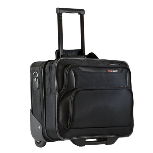 - Nylon with leather-look trim; integral trolley mechanism for easy mobility; fully padded section for laptops up to 15.6 inches; lockable zipper for added security; fully padded carry handles and a removable shoulder strap.
