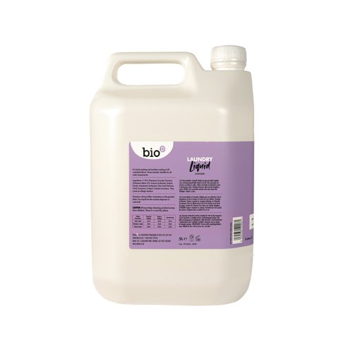 - Bring a touch of calm to every wash with this Bio-D Lavender Laundry Liquid, infused with 100% naturally derived lavender essential oil. This gentle, plant based non-bio formula delivers effective cleaning at low temperatures and is suitable for both machine and hand washing. Supplied in a five litre, fully recyclable, 100 percent, Post Consumer Recycled plastic carton that can be refilled and reused.