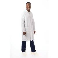 Professional unisex lab coat designed for medical and healthcare environments. Crafted from lightweight 195gsm polyester-cotton blend, offering durability and comfort. Featuring three practical pockets - one chest and two hip - with convenient concealed stud fastening. Classic white 42-inch length provides full professional coverage, suitable for laboratory, medical, and healthcare professionals seeking reliable and functional workwear.