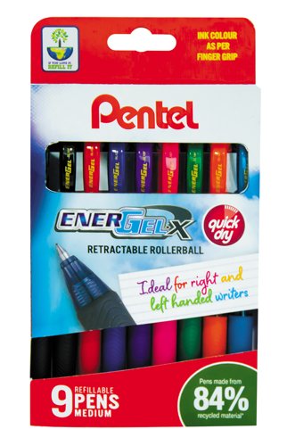 - Pentel EnerGel X Retractable Rollerballs packed in an acrylic wallet. Each pen contains our Quick Drying Liquid Gel ink which prevents the ink smudging or blobbing. Textured grip and translucent colour finish to each barrel. 0.7mm tip. Contains 84% recycled material percentage based on total weight of the products excluding the ink and refill. Wallet contains 6 colours 1 piece each of Black; Blue; Pink; Sky Blue; Green and Violet. Ideal pens for art and craft work; everyday writing; school and office use.
