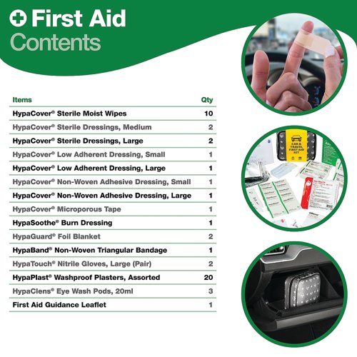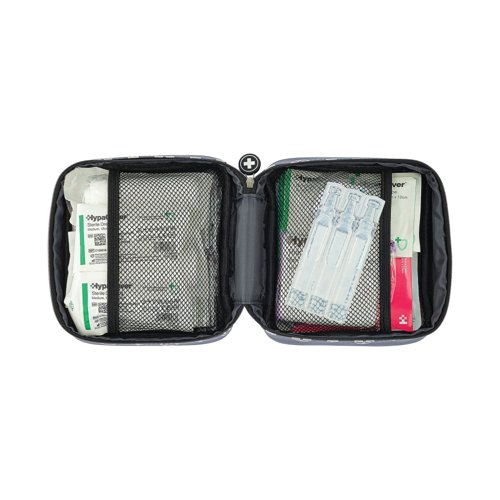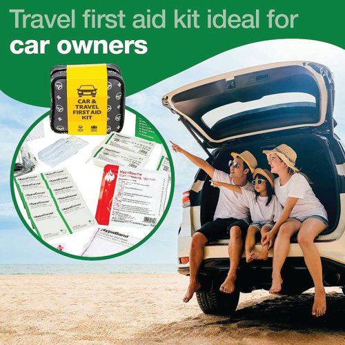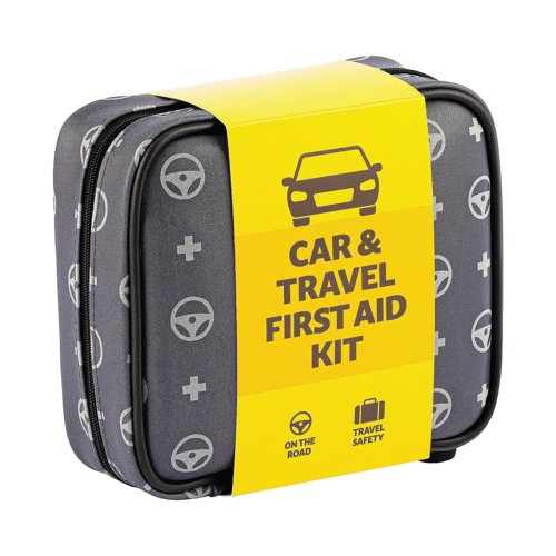 - Safety First Aid Group's Car and Travel First Aid Kit is the ideal first aid kit for cars, providing immediate access to essential first aid supplies in emergency situations. Included in the first aid kit are sterile moist wipes, sterile dressings, microporous tape, burn dressing, a foil blanket, gloves, eyewash solution and more. This vehicle first aid kit comes in a reusable, zippered case designed to keep medical supplies neatly organised and well-protected. Inside, two secure mesh pockets help prevent items from shifting, making everything easy to find in an emergency. The case features a dark grey, water-resistant exterior with light grey decals of a first aid cross and a steering wheel, ensuring it's instantly recognisable as a motoring first aid kit. Built from tough, easy-to-clean materials, the case is designed to withstand the rough-and-tumble environment of your glove compartment, boot, or toolbox. A removable cardboard sleeve wraps the kit and includes a detailed list of contents on the back so that users know exactly what's included when every second counts.