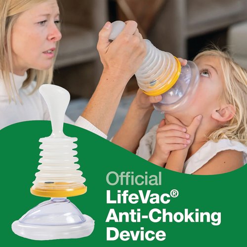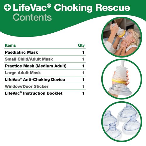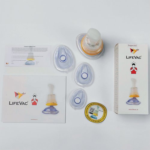- In time-critical situations, having the equipment on hand to dislodge a blockage in the windpipe is essential. The LifeVac Anti-Choking Device Home Kit is designed for use if back blows and abdominal thrusts aren’t sufficient. The kit includes one LifeVac unit, a paediatric mask, one small child/adult mask, one medium adult (test) mask, one large adult mask, an instruction booklet and a window/door sticker to easily identify where a LifeVac is stored. LifeVac features two patented discs that accommodate interchangeable mask sizes, recognising that one size does not fit all. It also incorporates a patented one-way valve system that prevents air from being forced through the mask during use. LifeVac’s non-invasive design ensures that no tubes can push the tongue back or drive the obstruction deeper during a panic situation. This design also prevents tubes from becoming blocked, which could otherwise render the device ineffective if only part of the obstruction has been cleared.