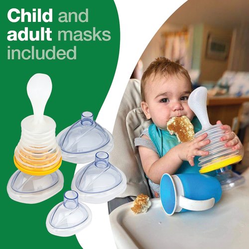 In time-critical situations, having the equipment on hand to dislodge a blockage in the windpipe is essential. The LifeVac Anti-Choking Device Home Kit is designed for use if back blows and abdominal thrusts aren’t sufficient. The kit includes one LifeVac unit, a paediatric mask, one small child/adult mask, one medium adult (test) mask, one large adult mask, an instruction booklet and a window/door sticker to easily identify where a LifeVac is stored. LifeVac features two patented discs that accommodate interchangeable mask sizes, recognising that one size does not fit all. It also incorporates a patented one-way valve system that prevents air from being forced through the mask during use. LifeVac’s non-invasive design ensures that no tubes can push the tongue back or drive the obstruction deeper during a panic situation. This design also prevents tubes from becoming blocked, which could otherwise render the device ineffective if only part of the obstruction has been cleared.