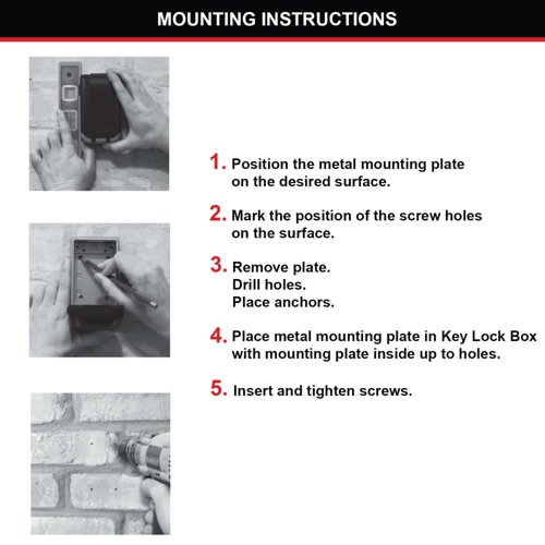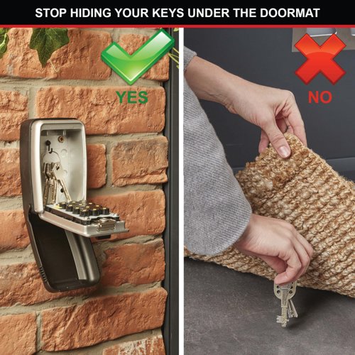 - This Master Lock wall mounted push button lock box provides convienience and security for keys, the perfect solution for shared key access. Set your own combination of up to 12 letters and numbers. For permanent installation. The lock box has a metal body for durability, a protective weather cover to prevent freezing and jamming, also a molded bumper and vinyl coated shackle prevents scratching. Push button access, with large buttons is very easy to use, with gloves, by the elderly or children. Exterior measurements are W790 x D520 x H1107mm.