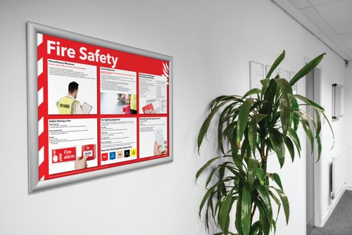 - The Fire Safety sign is a standard workplace safety sign designed for high visibility. Displaying the six steps to take: Minimise the potential, Minimise dangers to staff, Maintenance of fire precautions, Fire actions, Fire extinguishers, and Contacting the emergency services. This A2 poster provides clear guidelines for fire safety in the workplace.