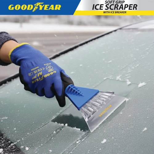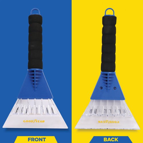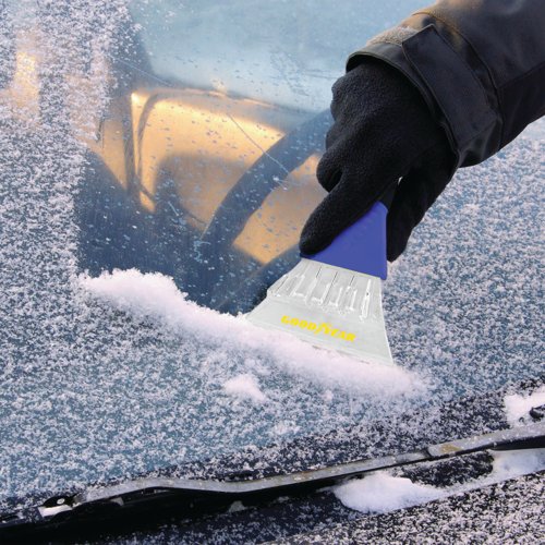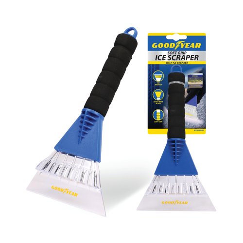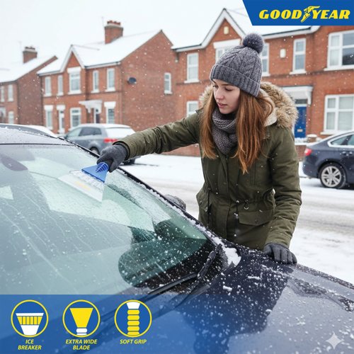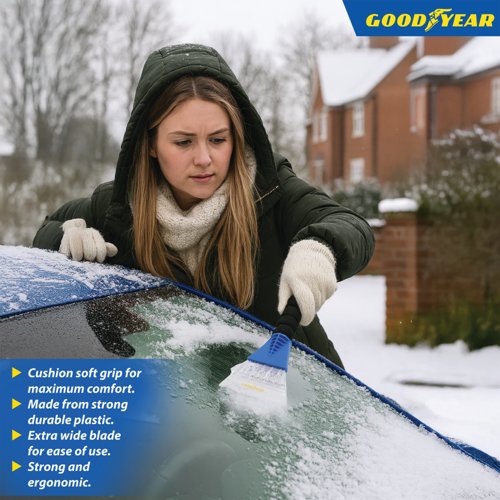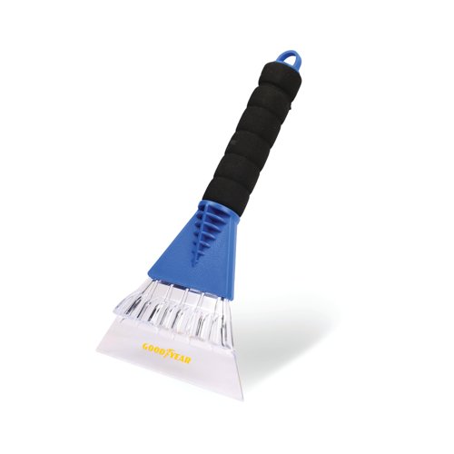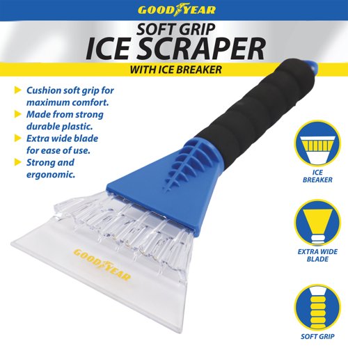 - The Goodyear Ice Scraper is a powerful and essential tool designed to handle the toughest winter conditions with ease. This ice scraper features a robust and extra-wide blade that is specifically engineered to break through thick layers of ice and frost, ensuring your vehicle’s windscreen remains clear and safe for driving. The wide blade design allows for efficient coverage, quickly removing ice, reducing the time and effort required to prepare your vehicle for the road. The Goodyear Ice Scraper is built with durability in mind. Constructed from high-quality materials, it is designed to withstand extreme weather conditions and heavy use. Whether you are dealing with a light frost or a thick sheet of ice, this scraper is up to the task. Its strong and rugged build ensures that it can tackle even the most stubborn ice, making it a reliable choice for any winter weather scenario. Comfort is key when it comes to using an ice scraper, and the Goodyear Ice Scraper delivers with its ergonomic handle and soft grip. The handle is designed to fit comfortably in your hand, reducing strain and allowing for a firm, secure grip. This ergonomic design not only enhances comfort but also ensures greater control, making the scraping process smoother and more efficient. Ideal for use with all types of vehicles, the ice scraper is a versatile addition to your winter car care kit. Its practical design makes it easy to use, even in cold conditions, and its compact size allows for convenient storage in your car’s glove compartment or boot.