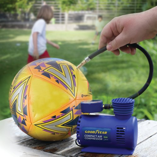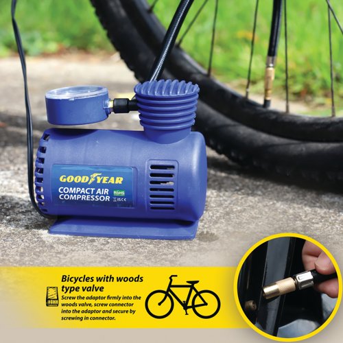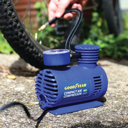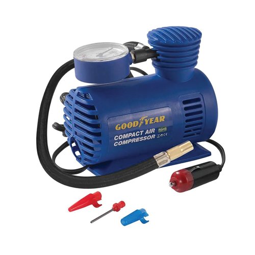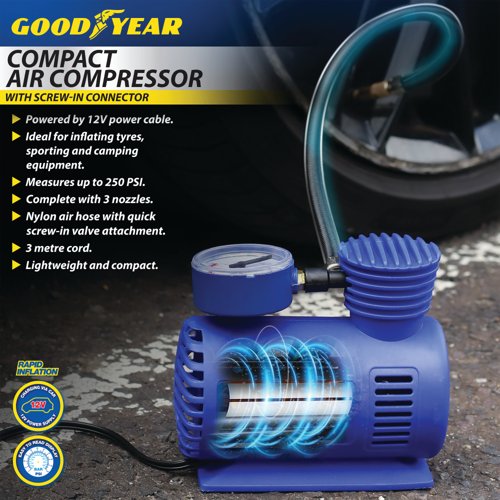 - The Goodyear Compact Air Compressor is ideal for the rapid inflation of tyres, sporting and camping equipment. Complete with three nozzles, this lightweight and compact design has a secure valve attachment with a nylon air hose with quick release chuck. Powered by a 12V power cable and measuring up to 250 PSI, the air compressor has a three metre cord.