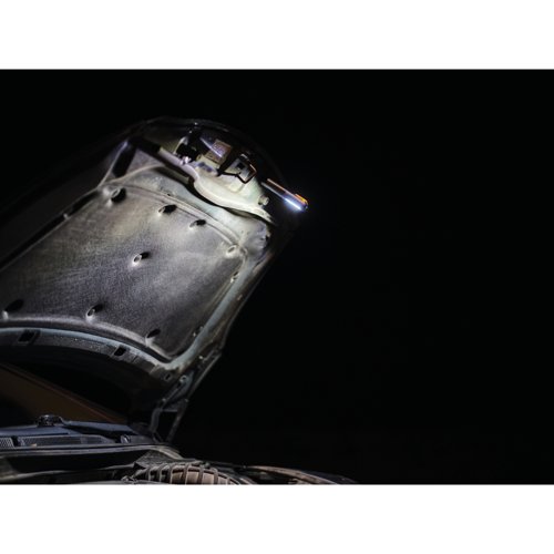 With its magnet, stand and hook, it is easy to place on metallic surfaces, or stand or hang. It frees both your hands to work unhindered. The IP42 rating means that the torch is protected against small particles (down to 1 mm) and water drips, even when tilted. Integrated USB-C charged battery; charging cable included. Runtime of about 3 hours; the top light alone has a runtime of 10 h.