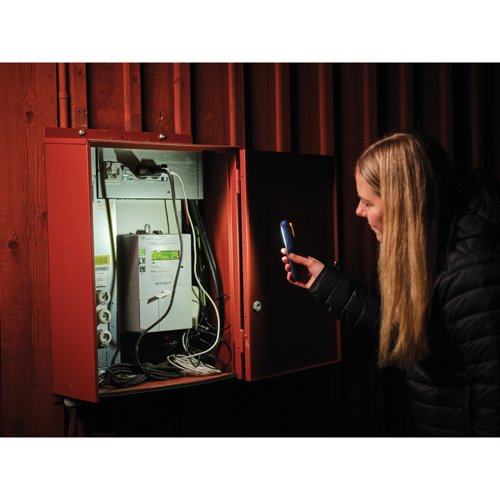 The torch light, with its light sources both on the front and top, gives good spotlighting for inspections and controlling in tight spaces. The light output of the front light is 150 lumens, and the top light is 50 lumens.